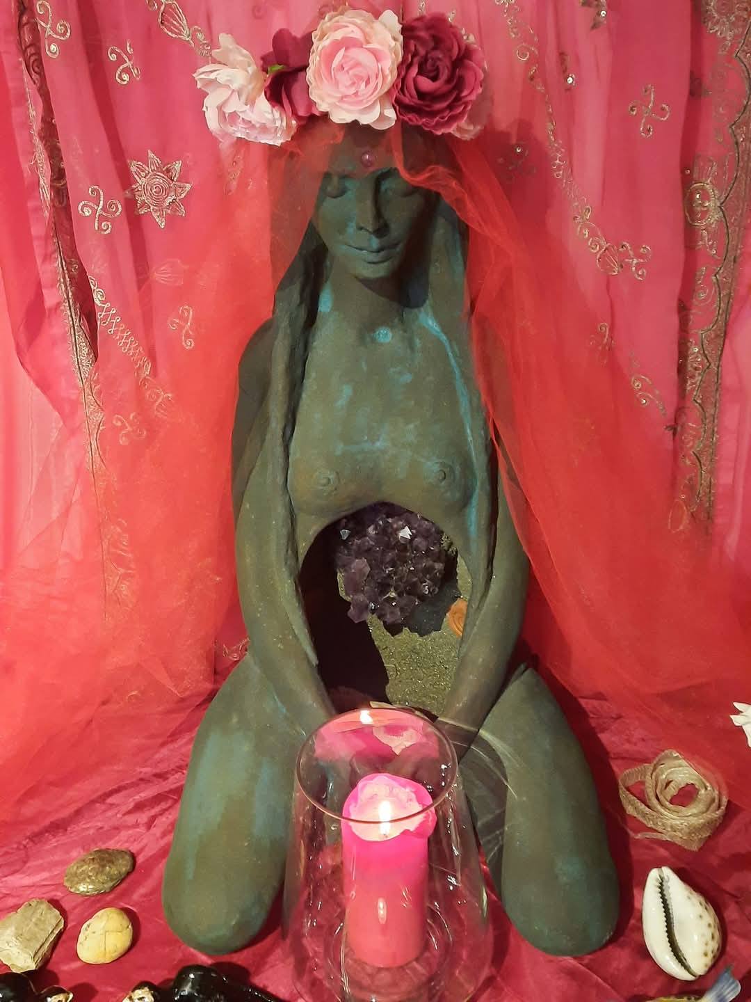 Neste espaço A honramos em cada uma das Suas faces: Donzela, Mãe do Fogo, Amante, Mãe da Água, Mãe da Abundância, Mãe da Terra, Anciã e Mãe do Ar.